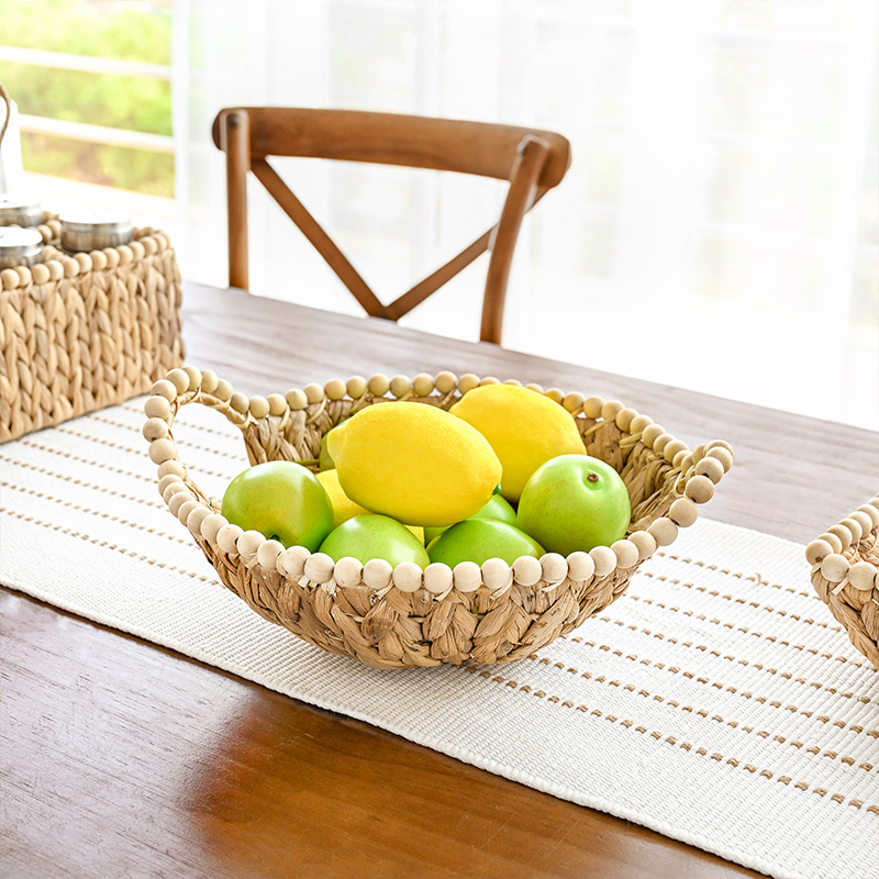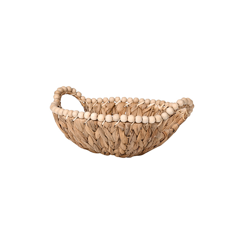 Diese breitere Variante der runden Schale bietet mehr Platz für Brot, Dekoartikel oder Bastelbedarf. Das Naturmaterial in Kombination mit dem eleganten Perlenrand macht sie zu einem dekorativen Highlight in jedem Raum.